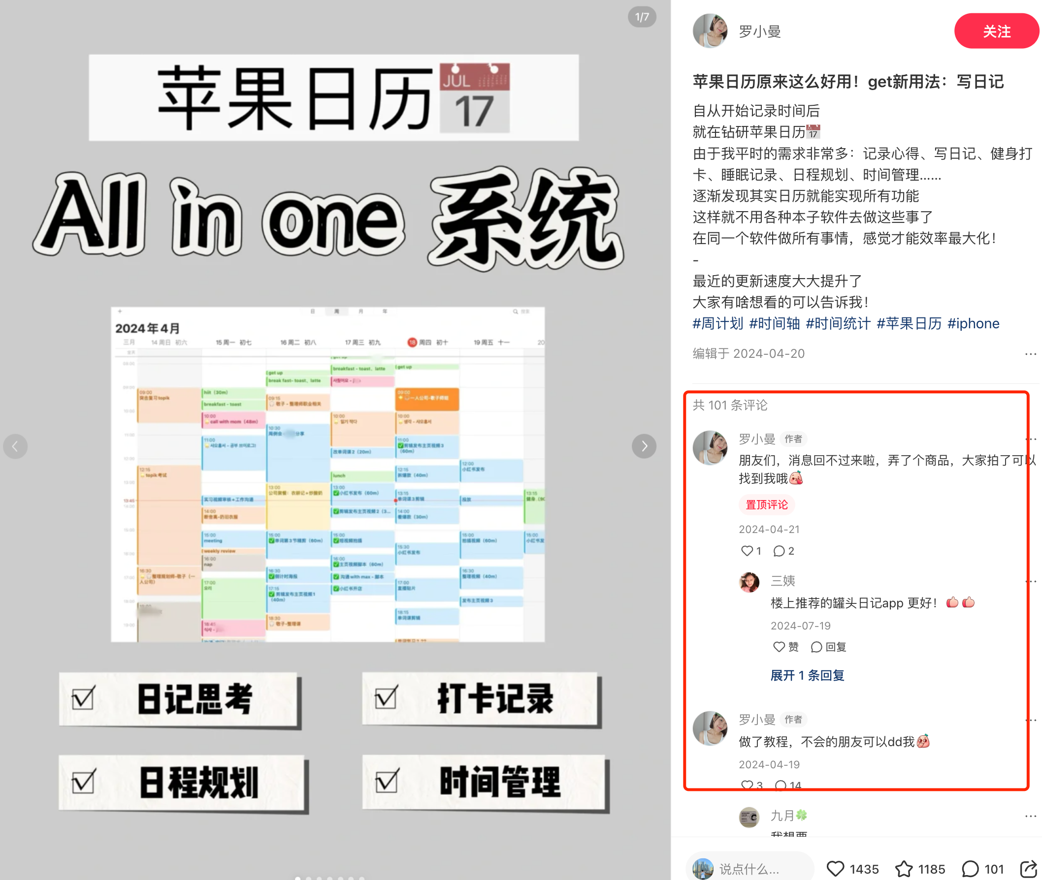 她的内容策略可以概括为**"间隔式精准打击"**:在持续输出小红书笔记的过程中,每隔几篇干货就会穿插一篇苹果日历的相关内容,并自然引流到付费商品。