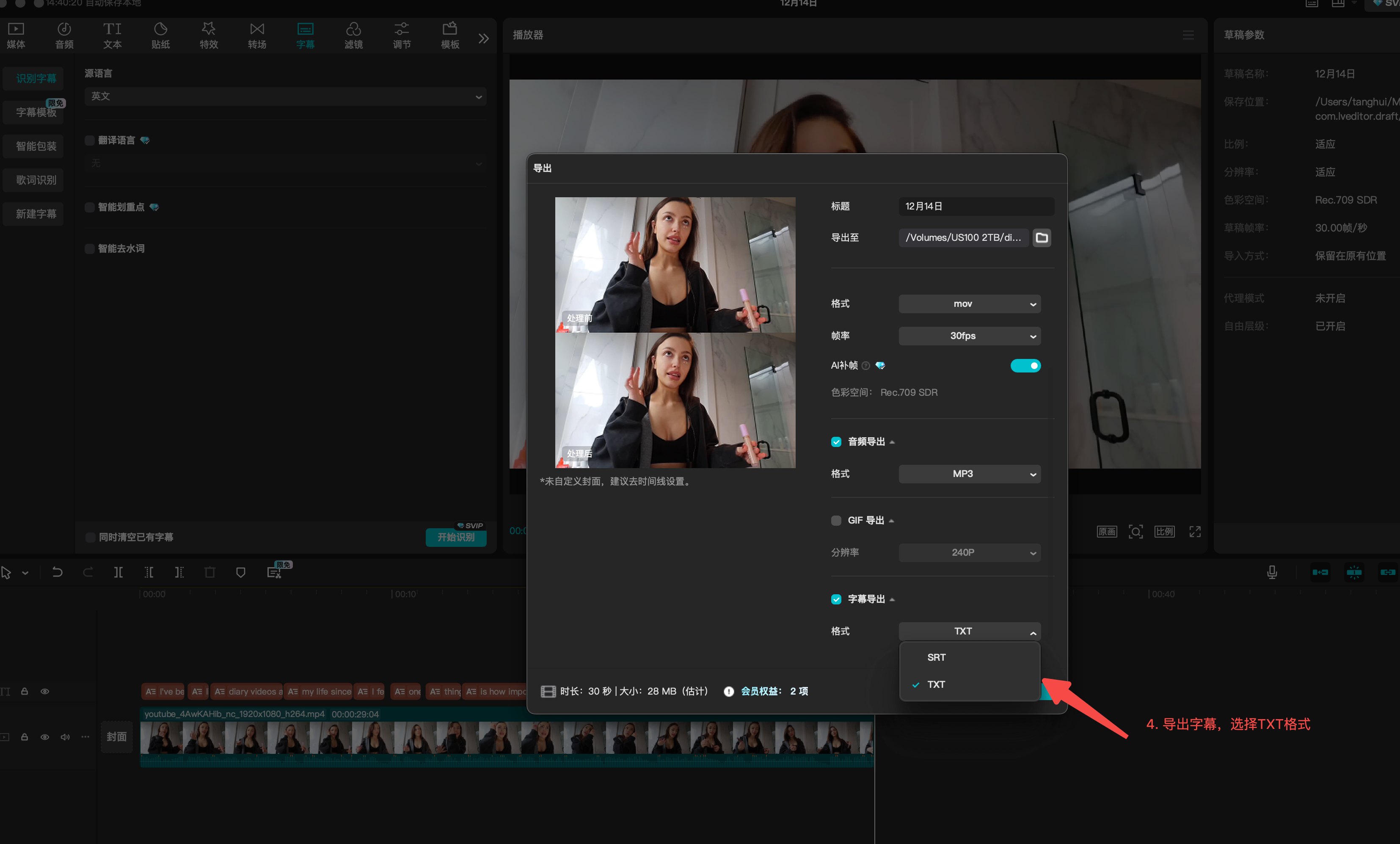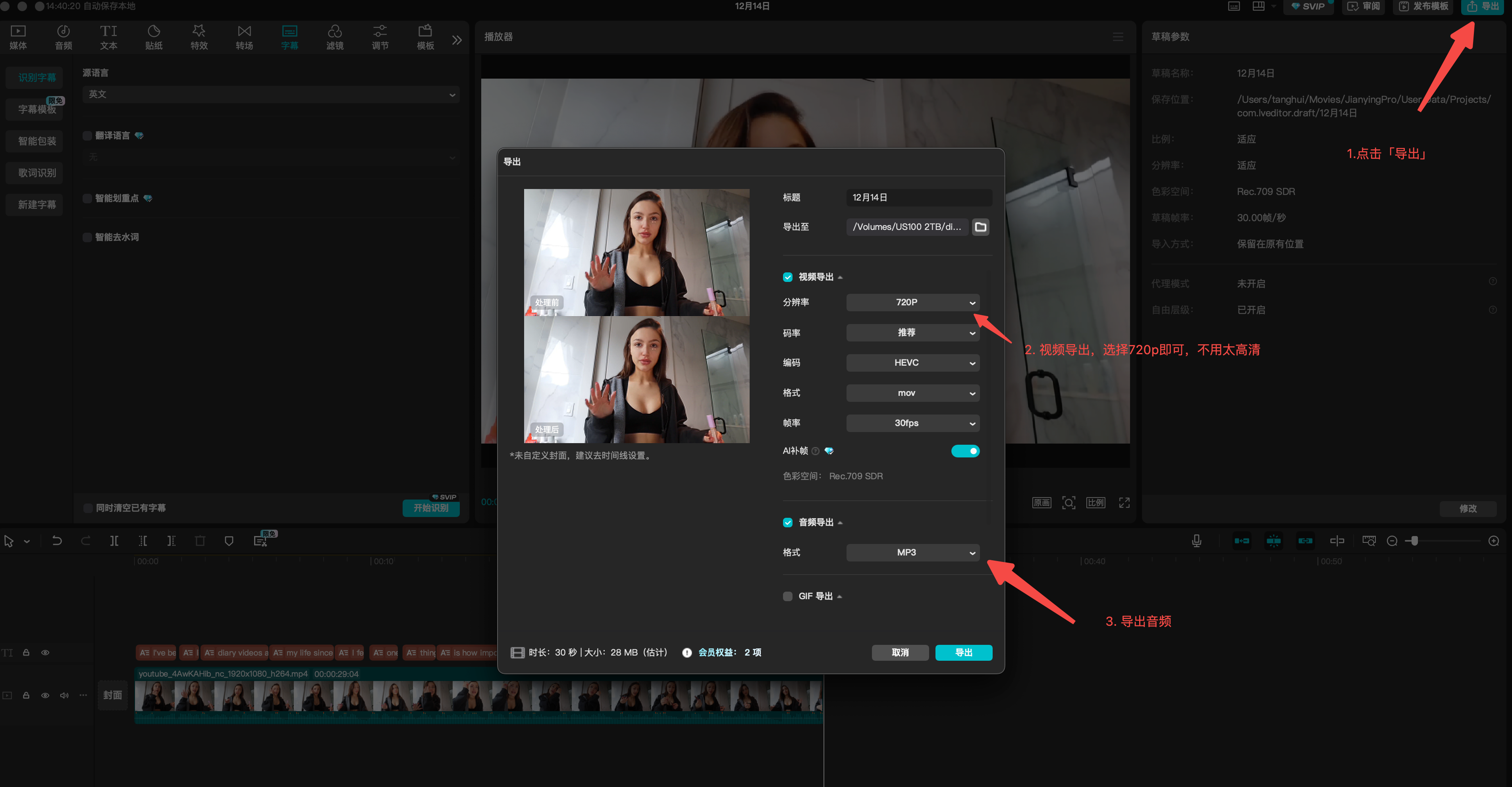 接下来你就只需要导出视频/音频/字幕就好,步骤如下图所示: