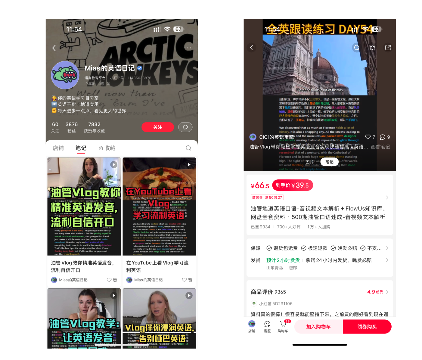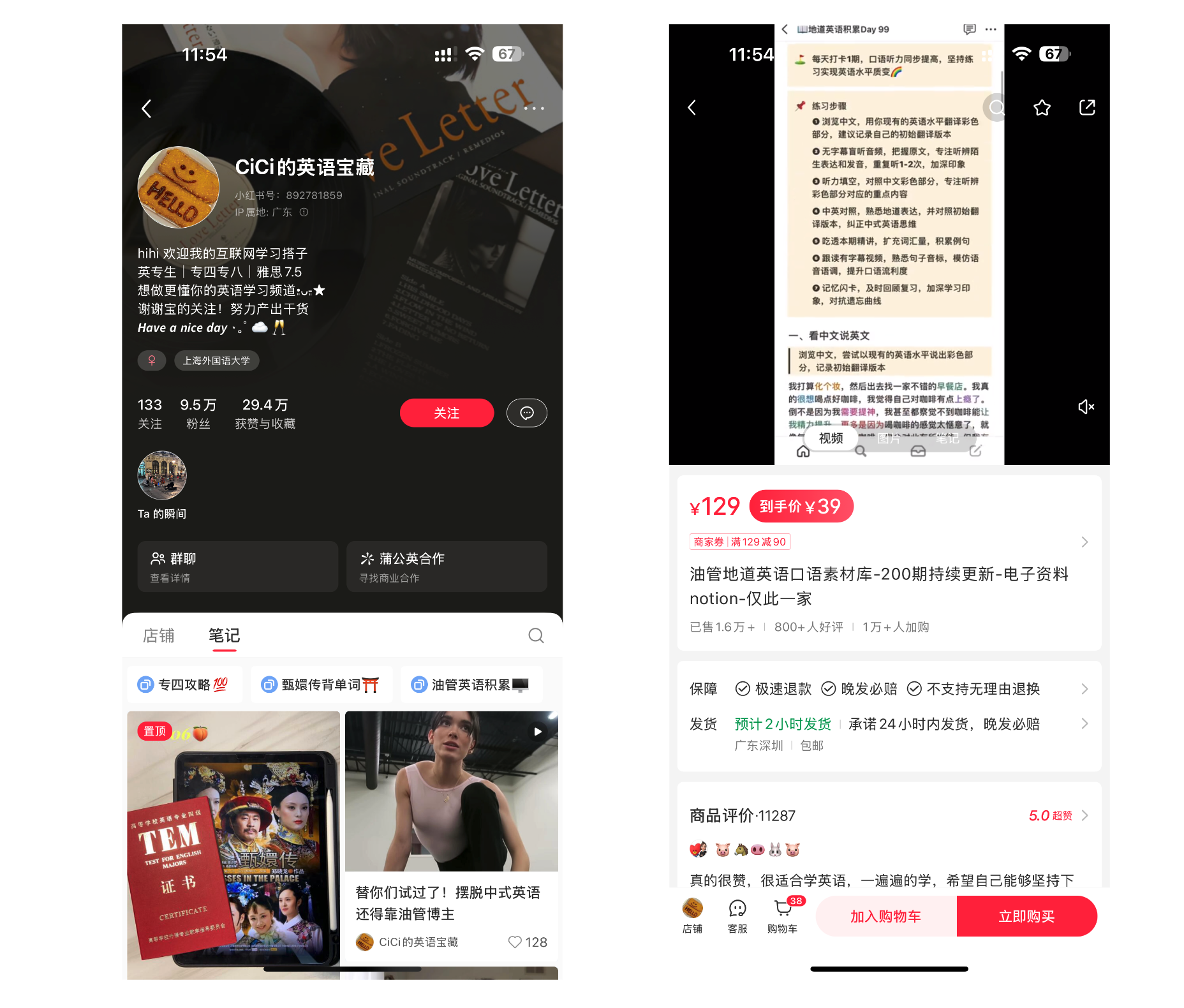 这个账号的粉丝数量只有3800多,但是她的《油管地道英语口语》39.5元,已经卖出了9934份。但是这个账号的总数看着不像是真实,因为笔记的评论和点赞都非常的低,感觉更像是刷单的,但是小红书是要收手续费的,刷单的成本也都在几万,似乎也没有太大必要,也有可能有站外导流。这个账号的真实性先作为存疑吧,大家可以当一个参考。