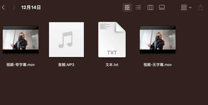 最终你得到的就是这样4个材料:2个视频 + 1一个音频 + 1个txt文件。这个时候其实我们所有的素材就已经准备完毕了,加上前期的工作,这个时候应该也就花了20分钟。