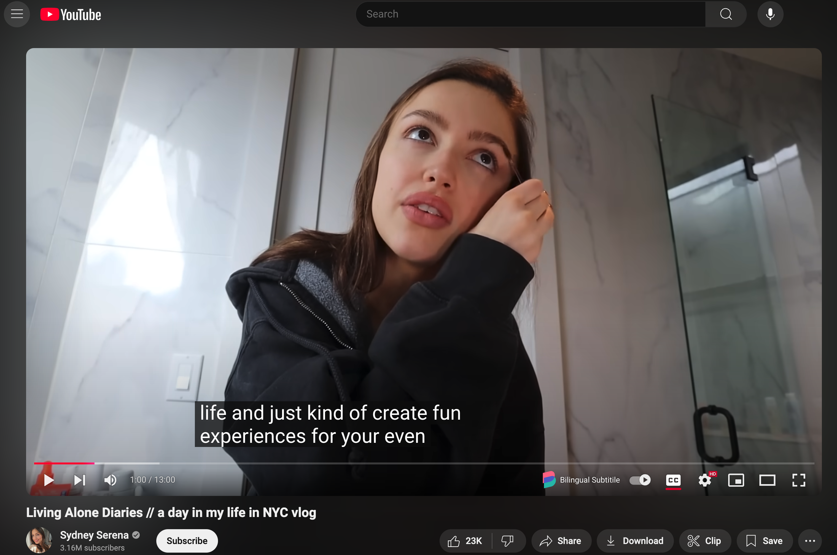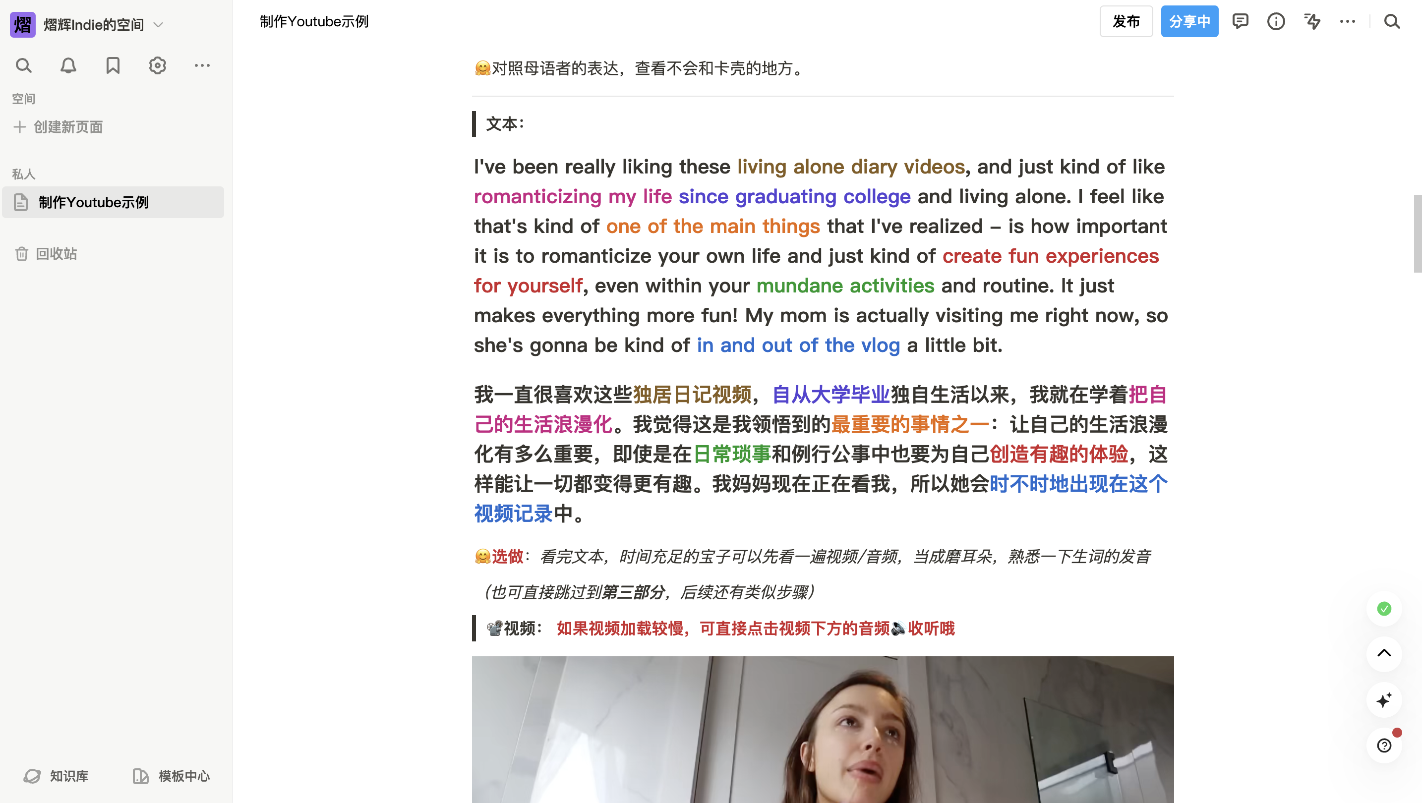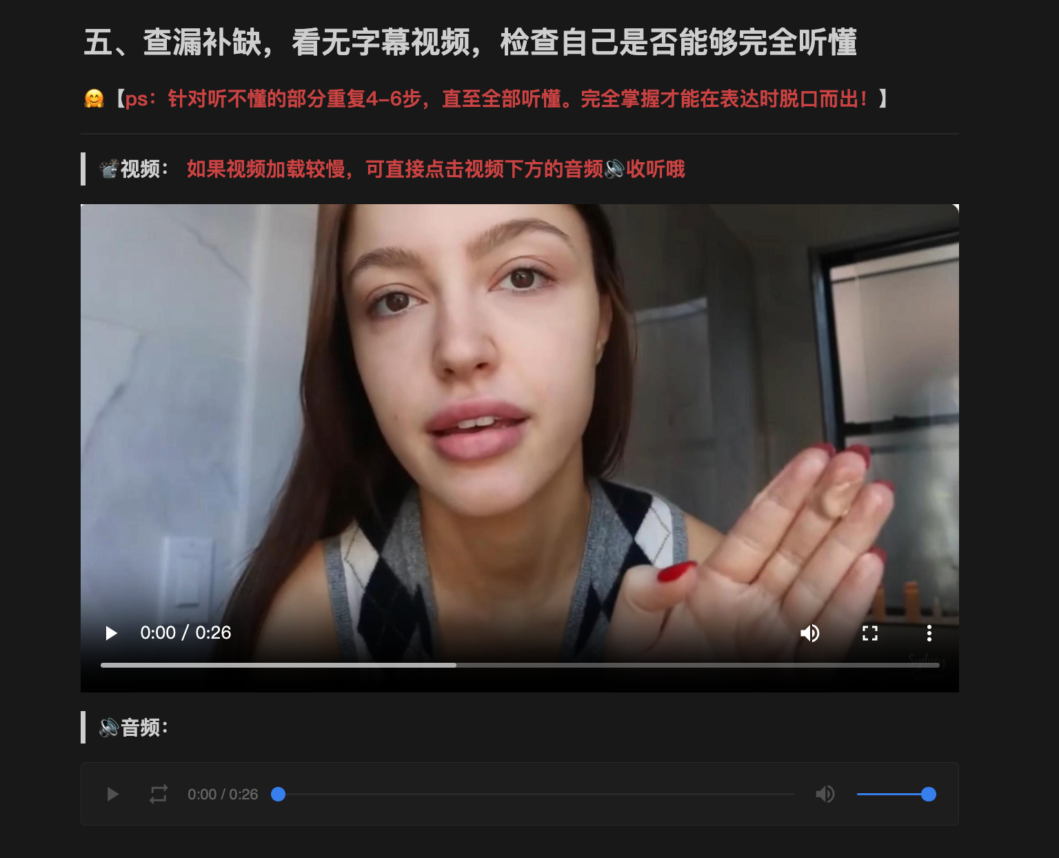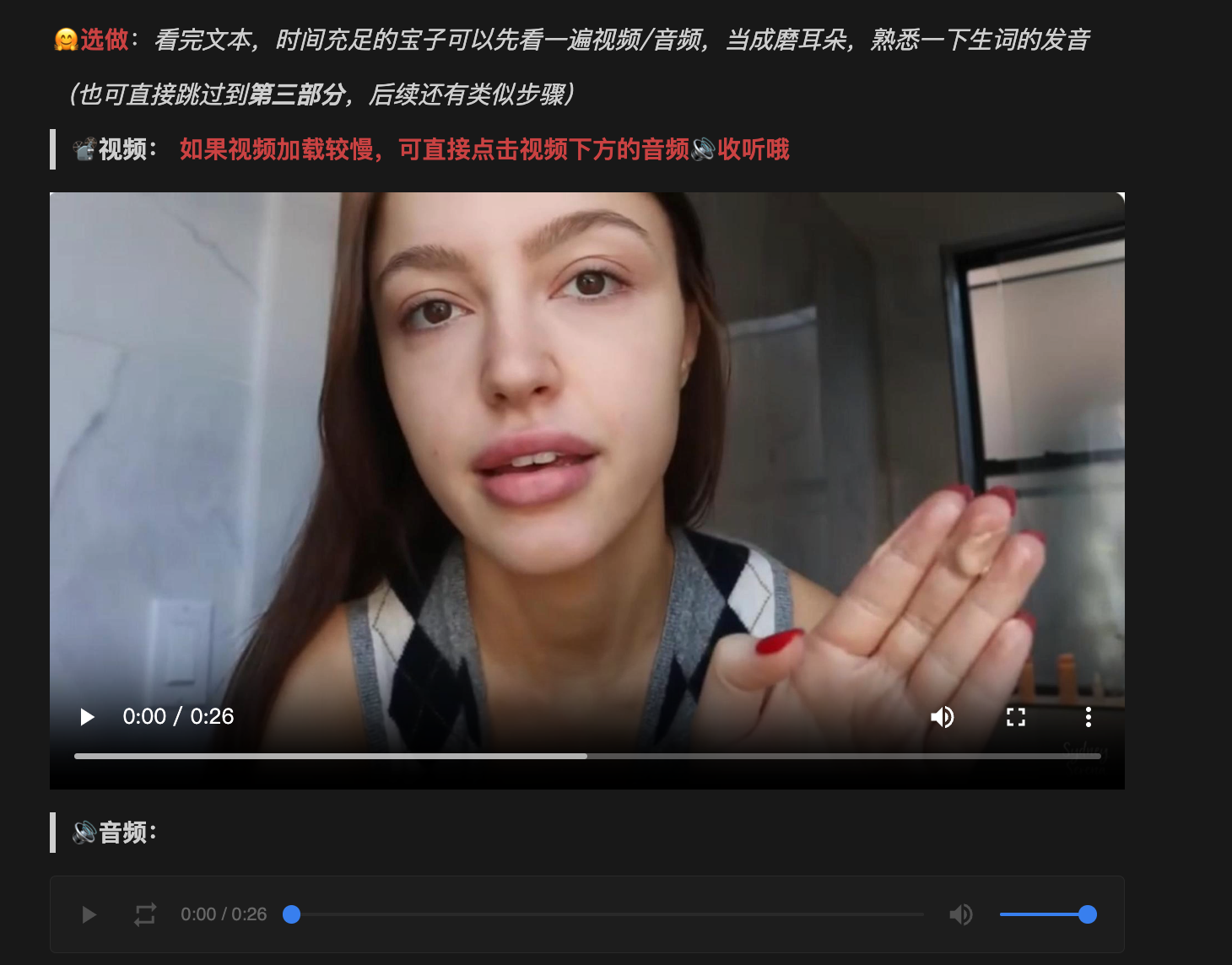 现在我相信你大概已经弄清楚了这类拆解Youtube的Vlog用作英语学习的账号是做什么的?以及卖什么的了?其实就是选取英语Vlog中的几十秒,然后做对应的精听和精读。也许很多读者可能已经被我刚才拆解的商品吓唬住了,制作这样一期多么难啊!?又有视频、又有音频,还要懂英语语法...