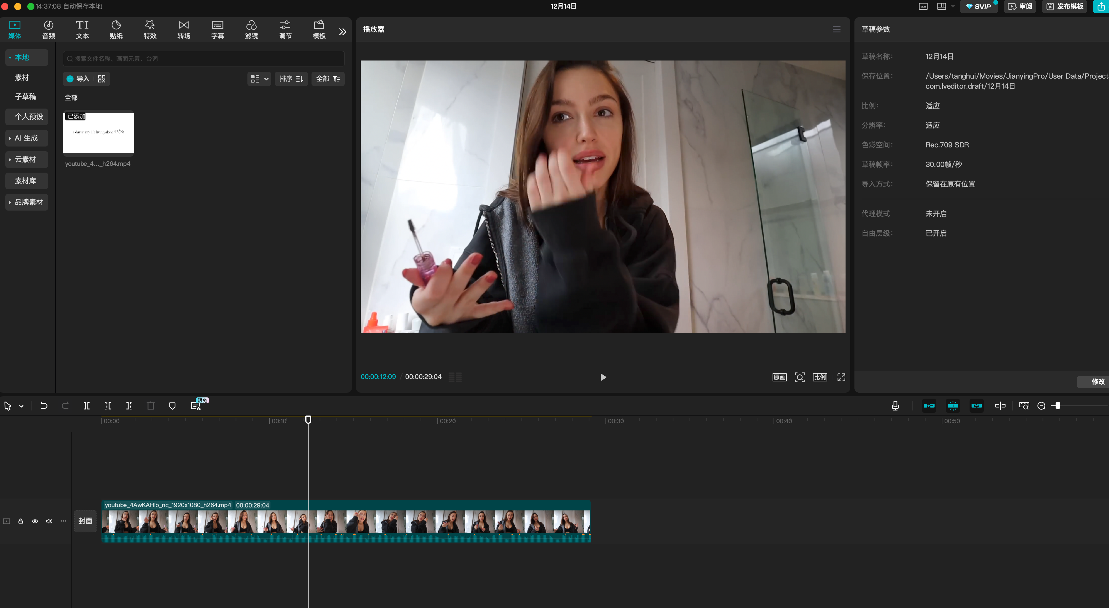 打开剪映Pro,然后导入我们刚才下载的视频,然后将我们刚才的视频掐头去尾,只保留我们想要的那30s视频