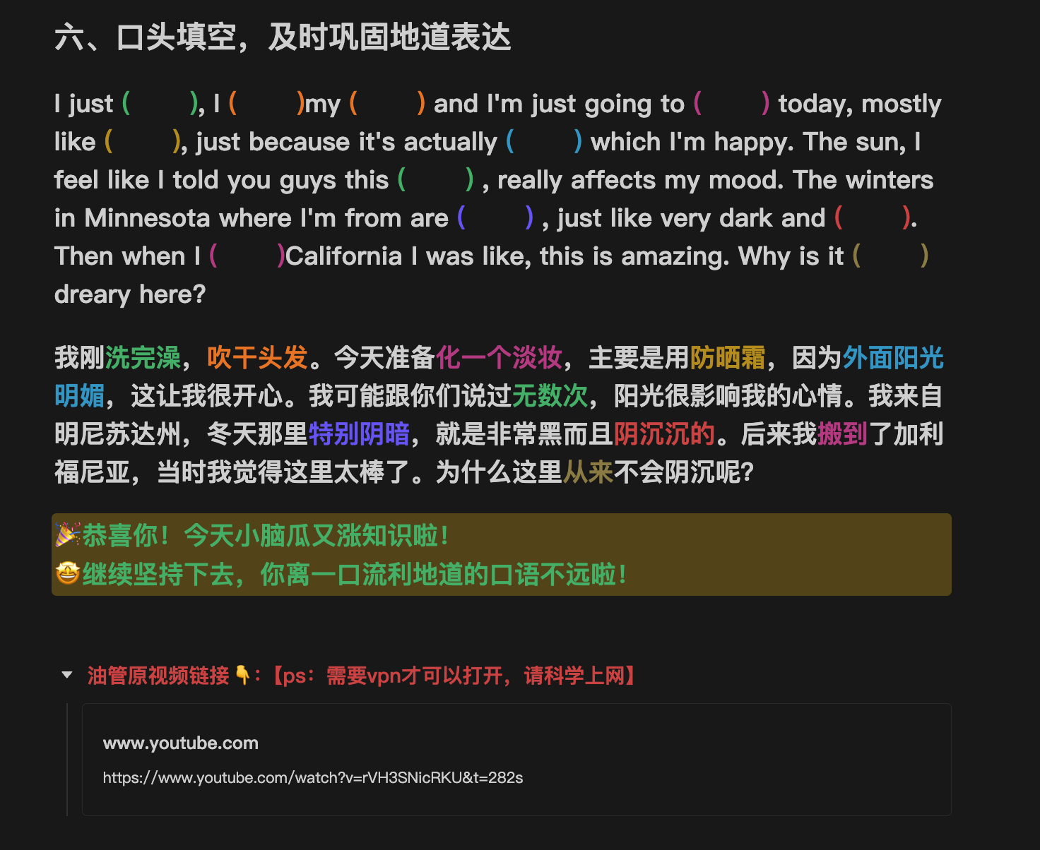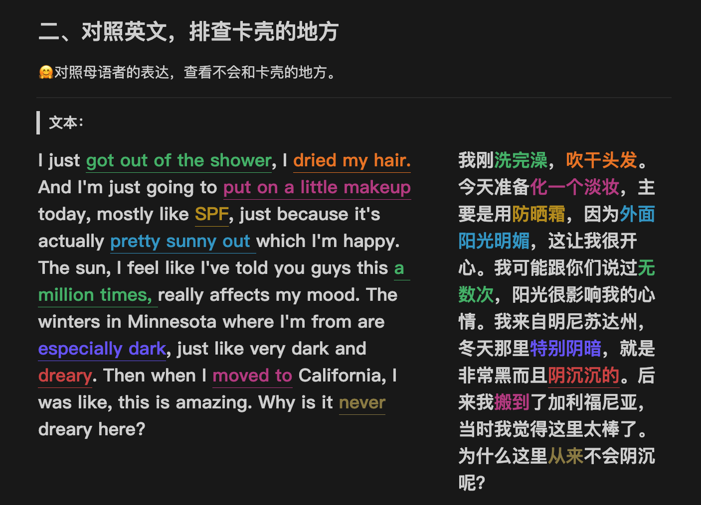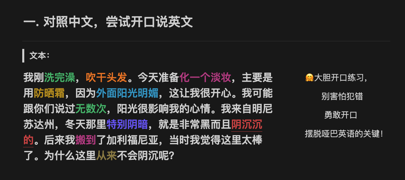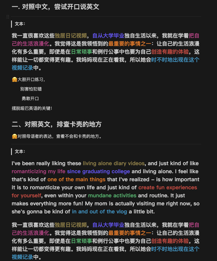 同样这一步你将文本内容给到ai让其进行翻译,并且列举当中其出现的高级词汇或者短语。这些列举出来的就是我们需要高亮的单词。然后我们将ai给到的英文和中文粘贴到我们的模板当中,并且将ai给出的高级词汇和短语进行高亮就好,记住高亮的颜色尽量五彩斑斓一些。