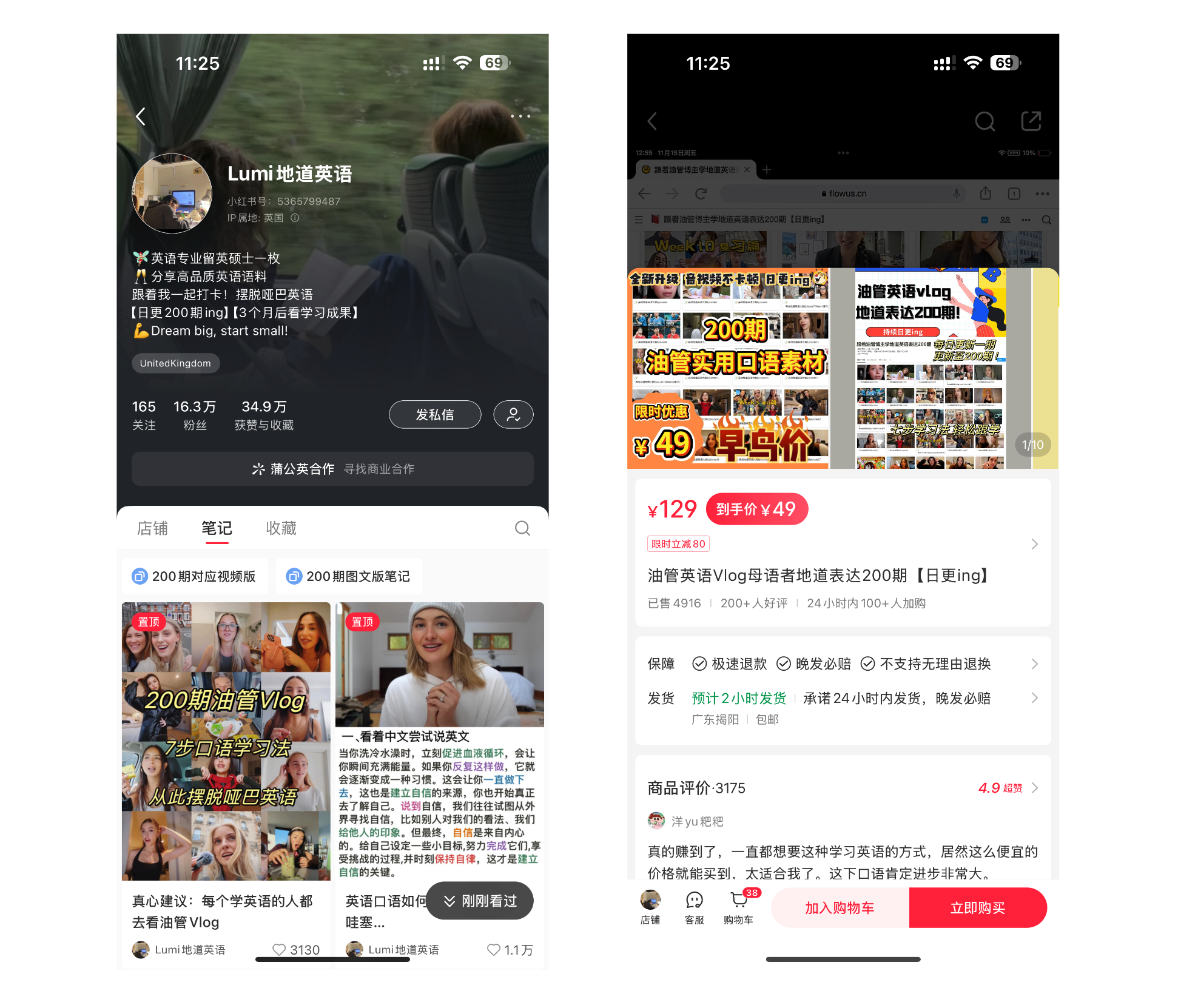 本期拆解的一个副业是一个小红书博主,她是一名在英国留学的英语专业硕士,在小红书上面的商品《油管英语Vlog母语者地道表达200期》,单价49元,截止我写专栏文章的时候,目前已经卖出了4916份。