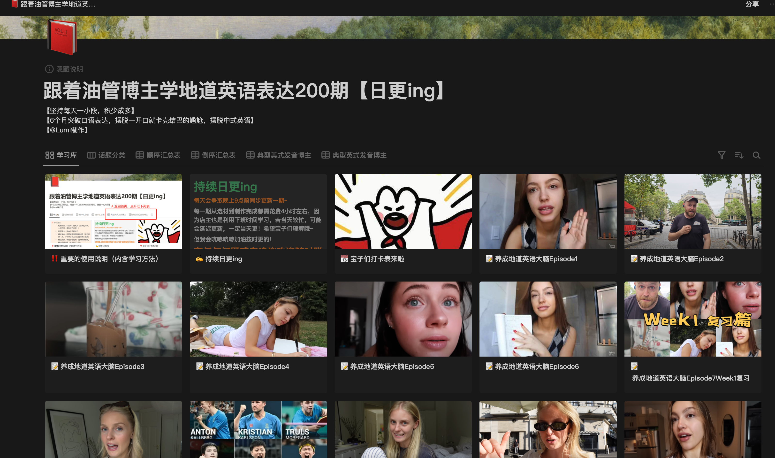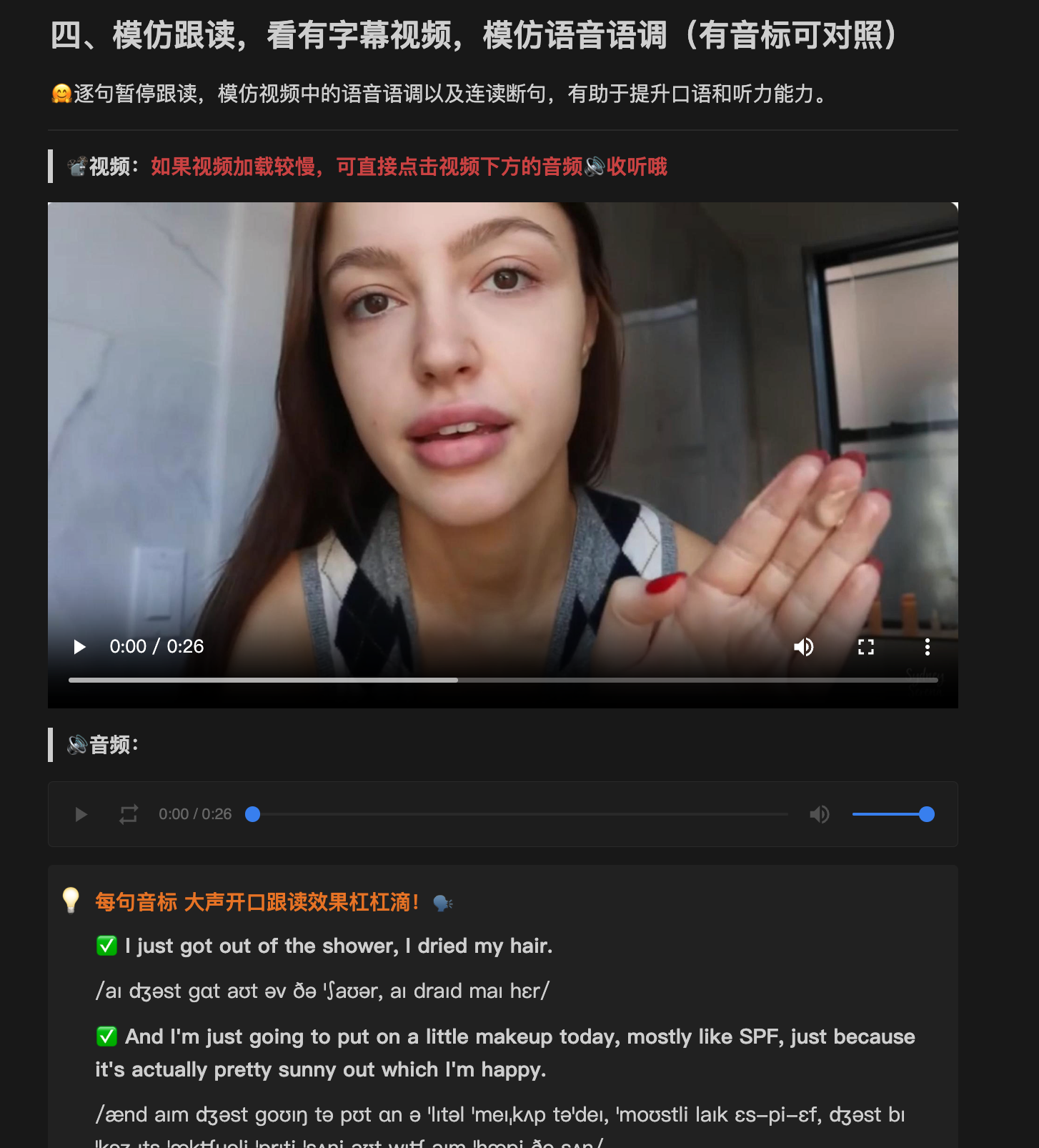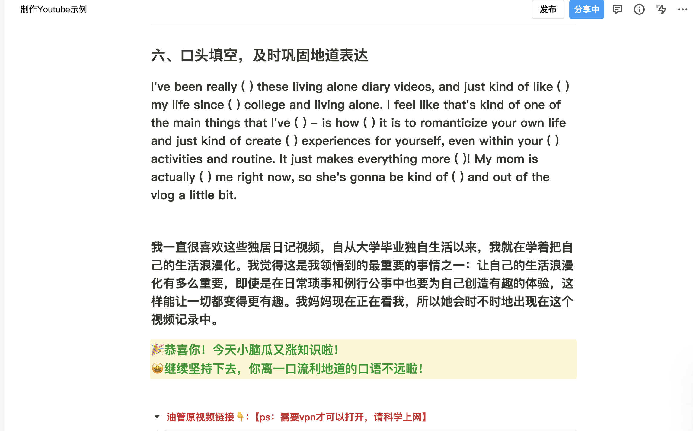 好的,如果你对这个副业感兴趣,现在我们就来看看如何结合AI的能力,制作一个类似的Youtube英语学习类账号吧!最后有我制作的示例材料的链接,大家也可以点击查看。
