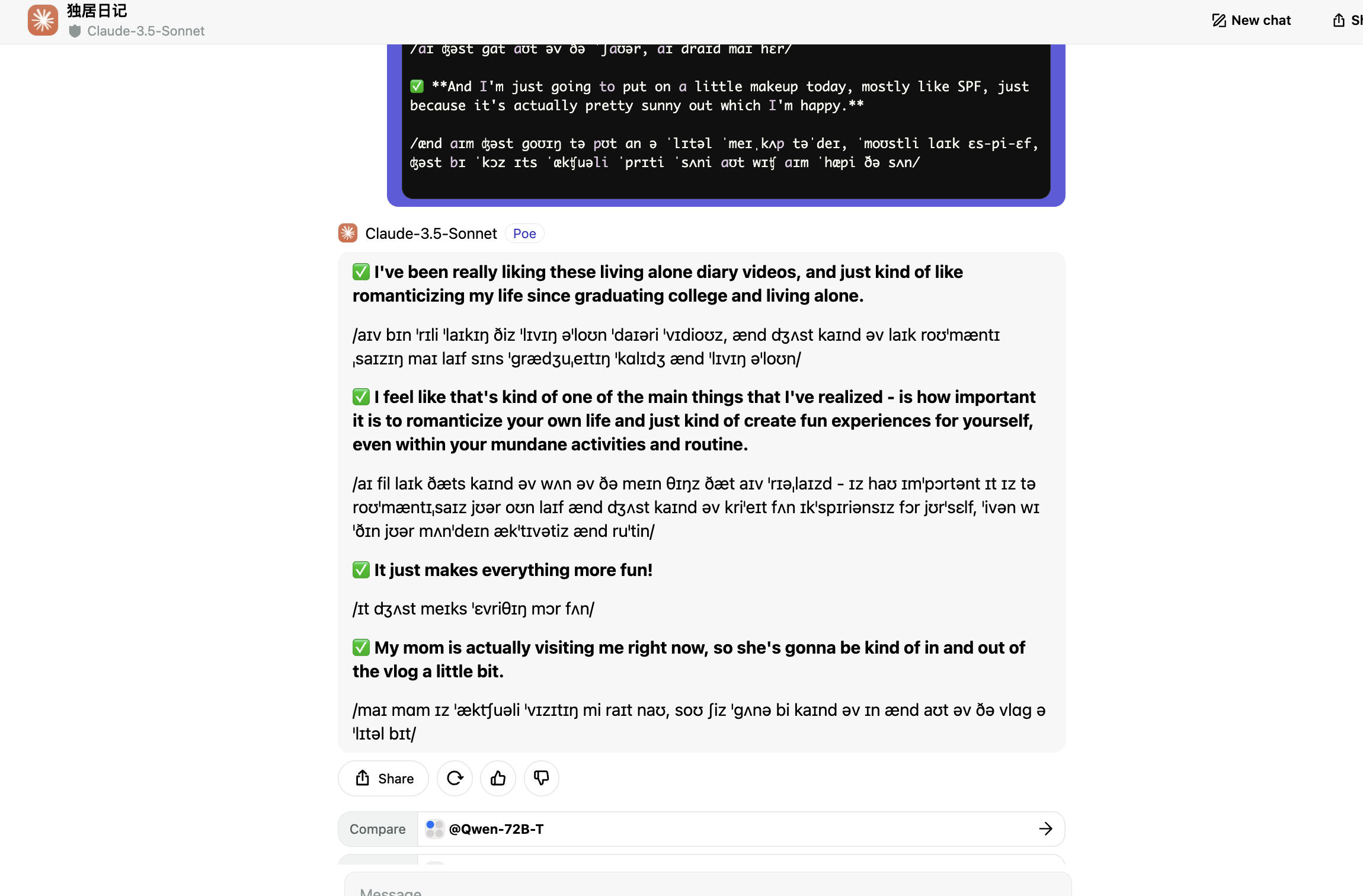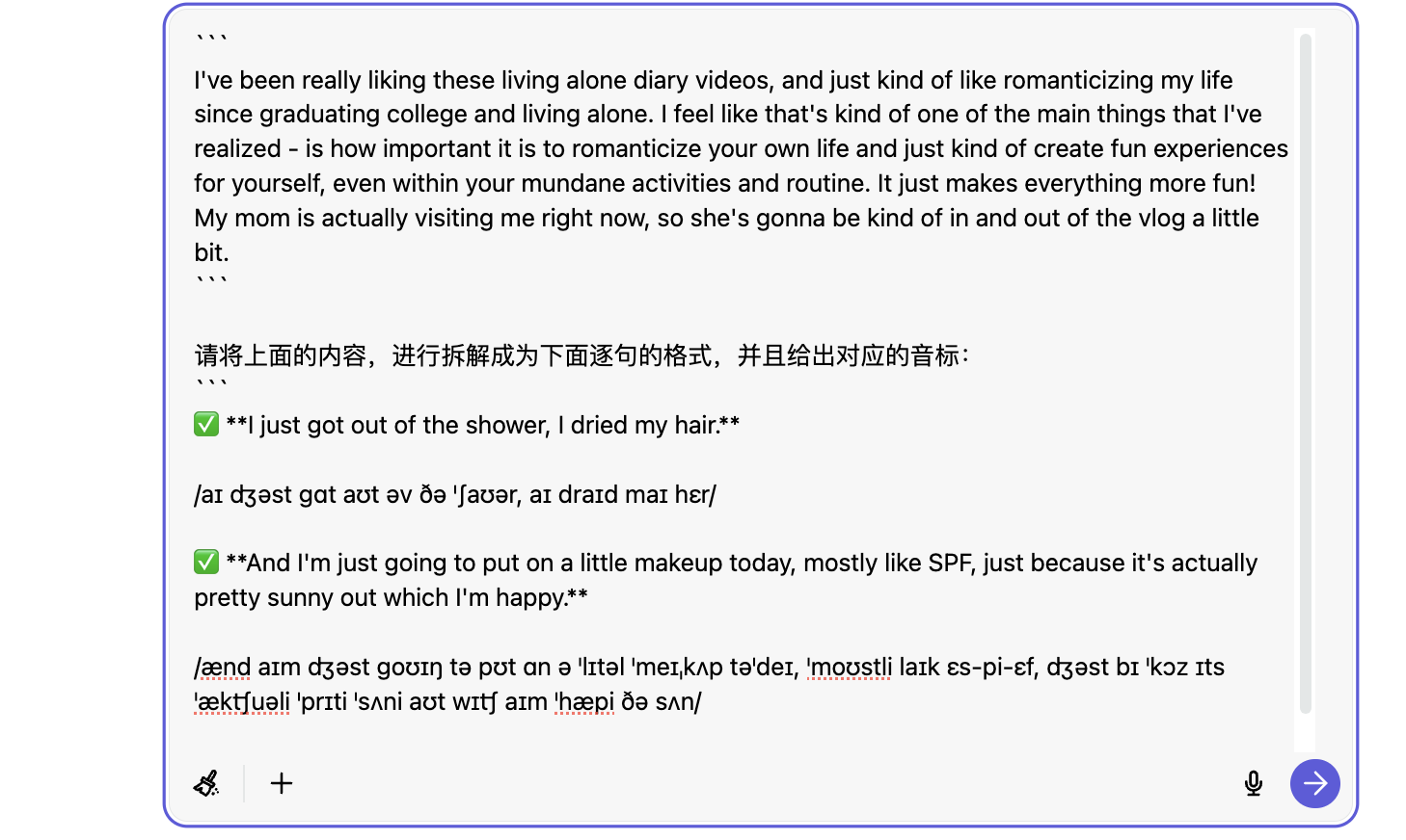 第4部分需要实现模仿跟读,我们需要AI将上面30秒的文本,拆解成为逐句的形式,并且给出音标。也很简单,我们只需要将内容给到AI,然后把对应的格式示例给到AI就好,这是我下面的提示词: