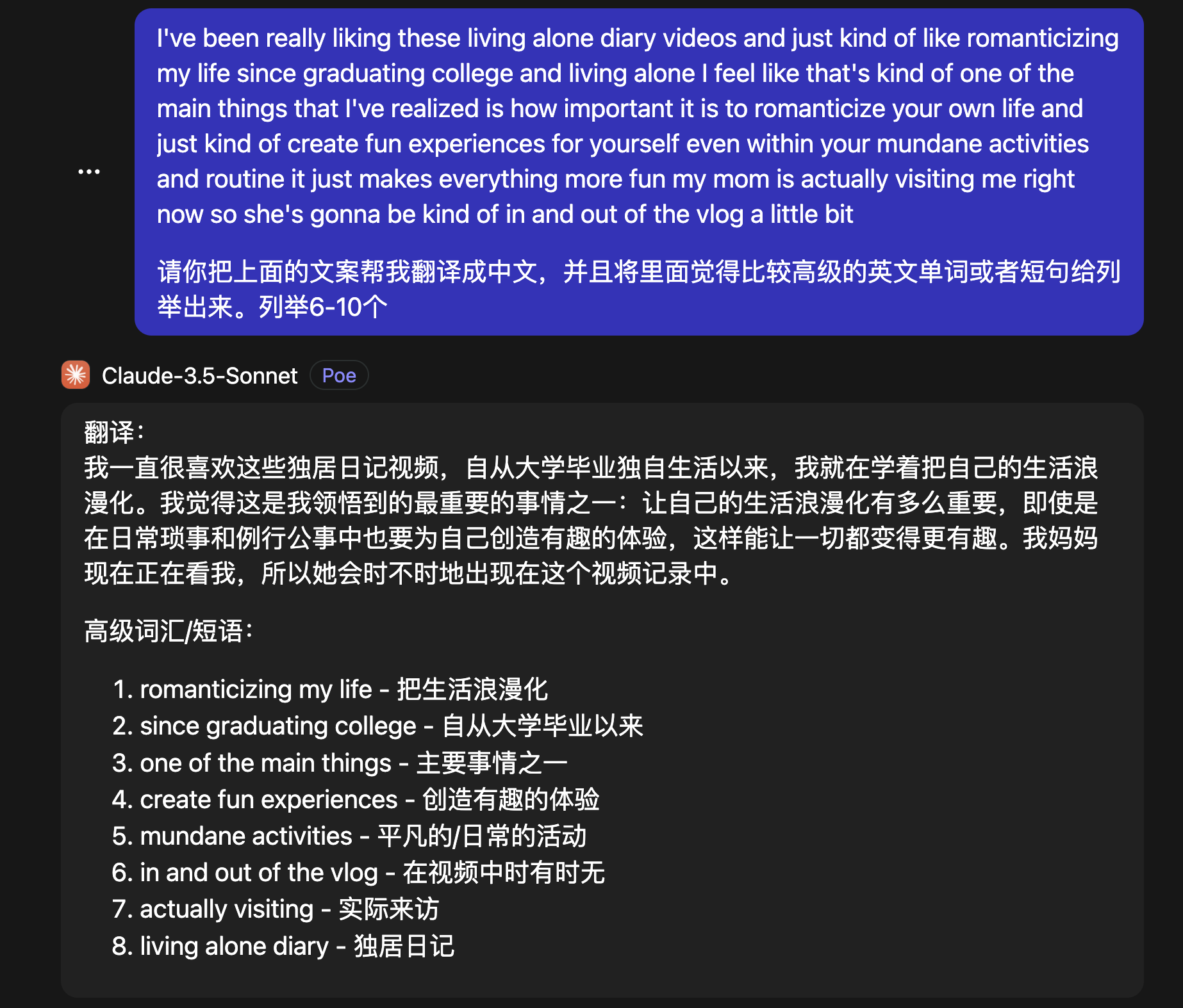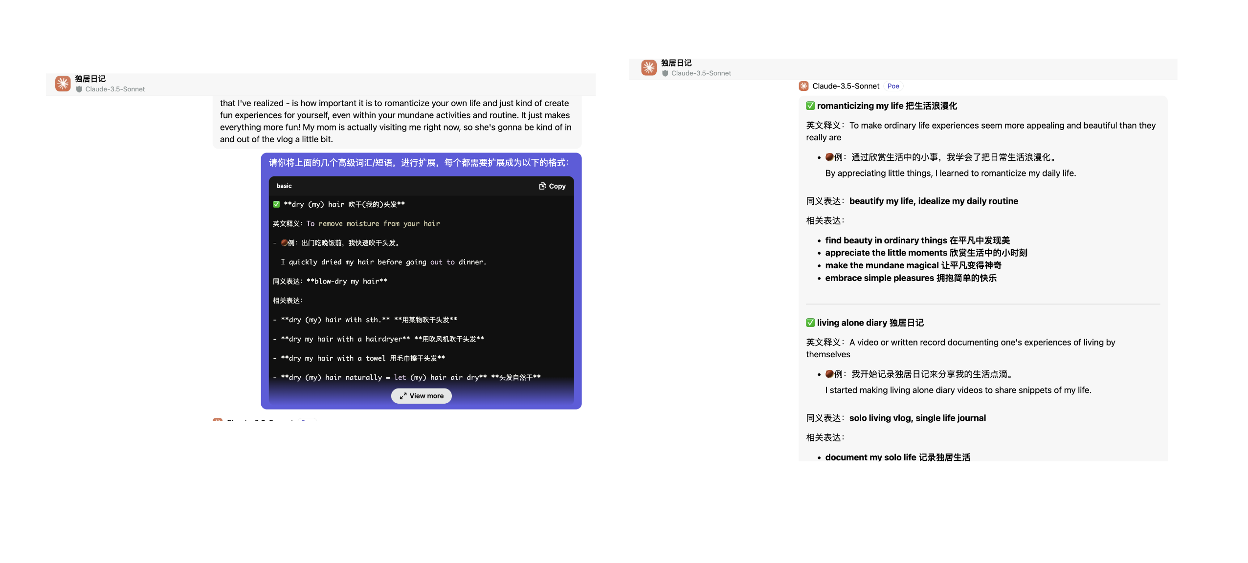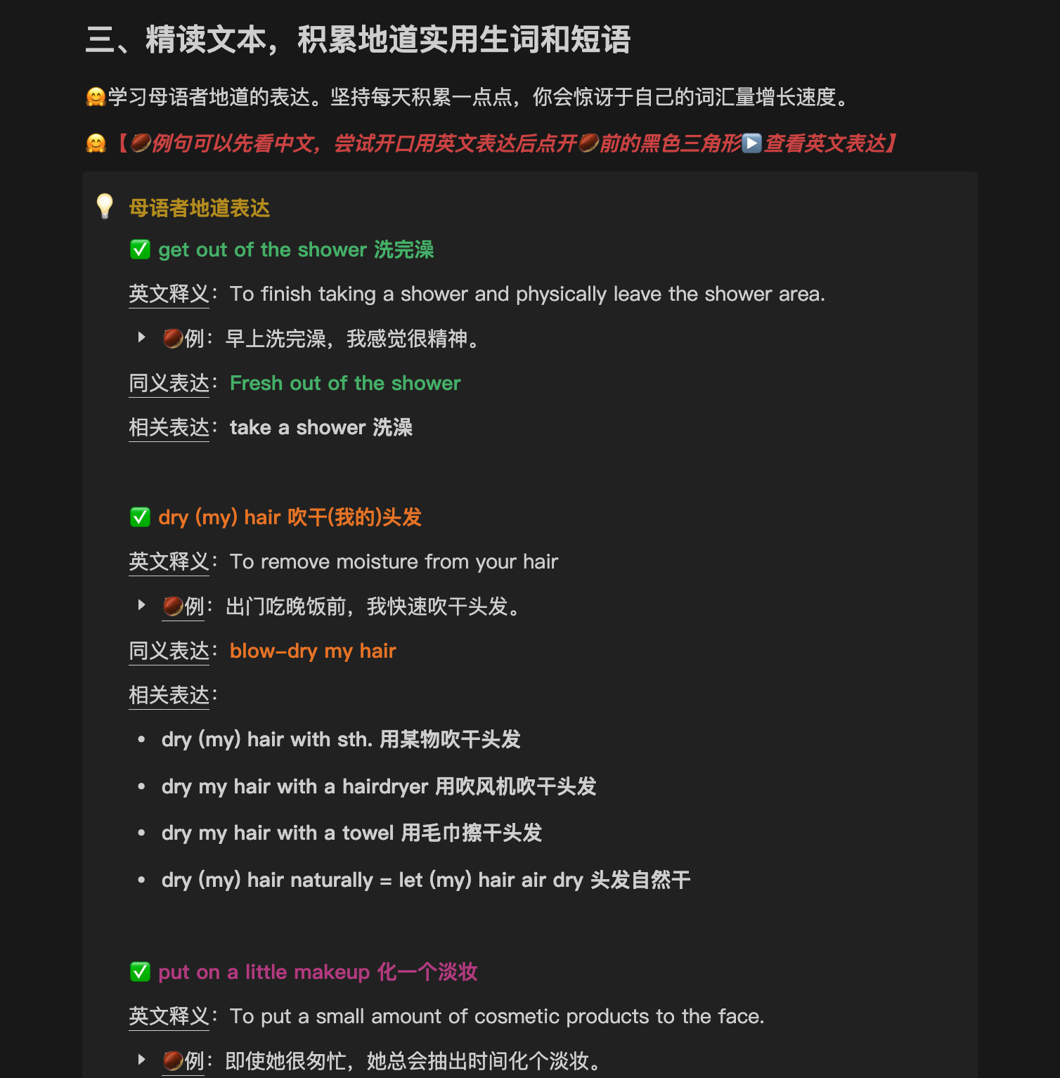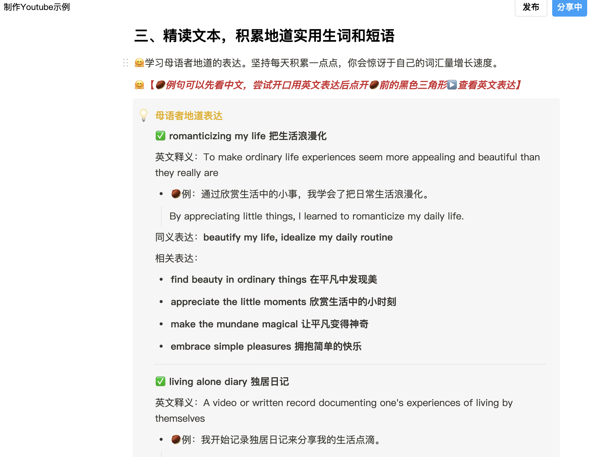 接下来就是制作第三部分,我们把上面AI给到的「高级词汇和短语」,让其进行扩展。并且给到对应的格式示例。