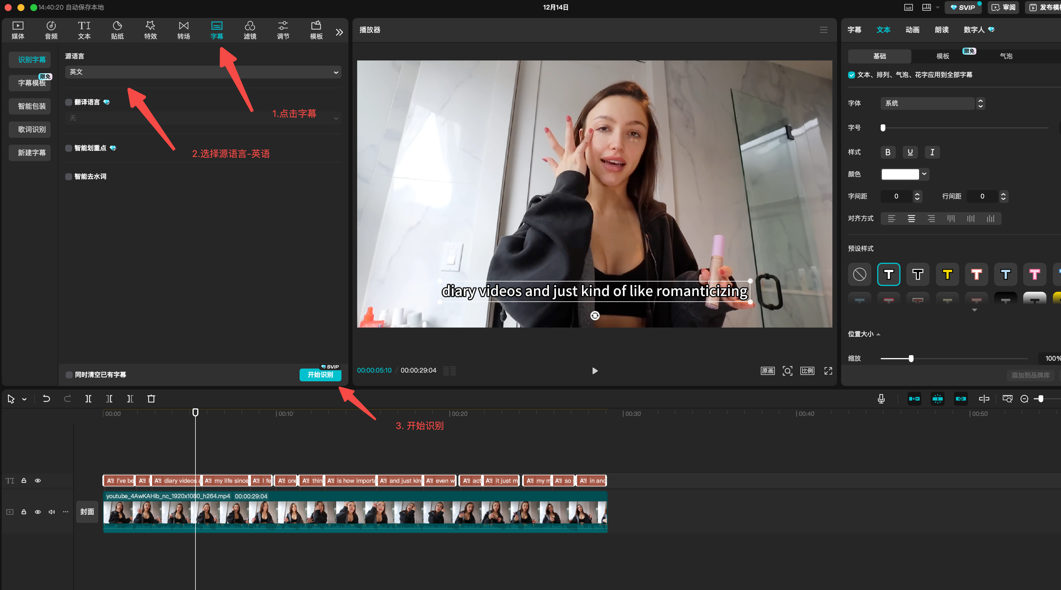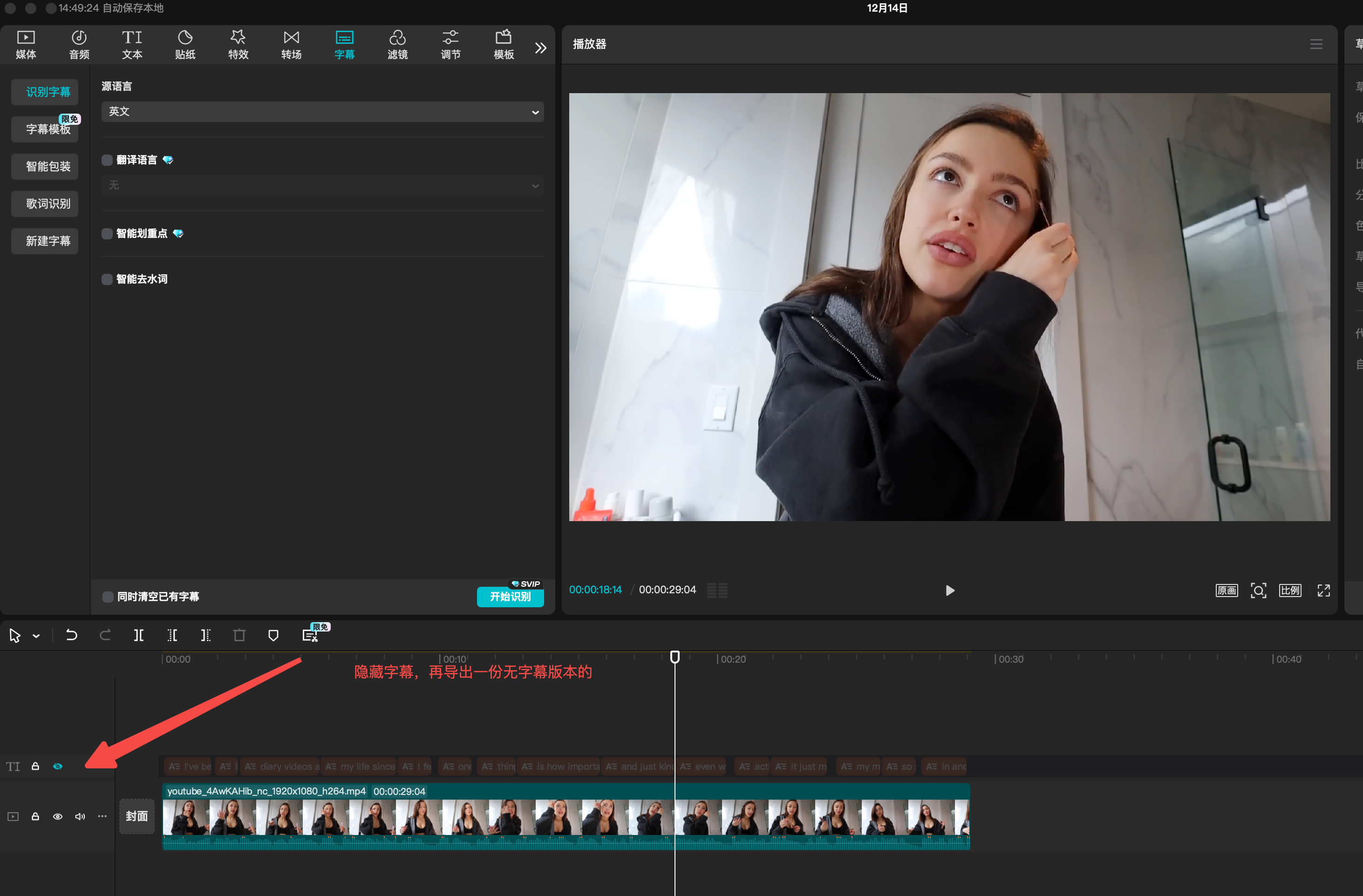 接下来我们要给视频添加上英语字幕,非常简单30s搞定!
