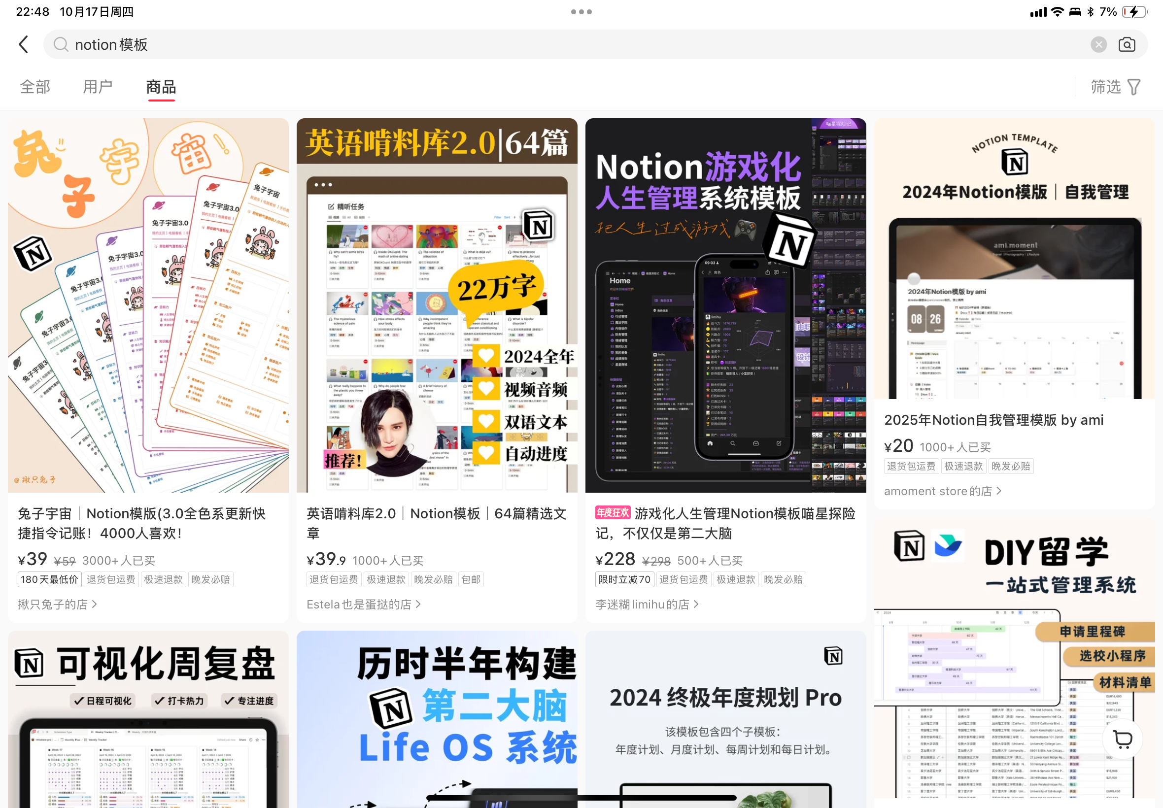 同时我认为模板的生意也是普通人做副业的最好方式之一,甚至可以去掉这个“之一”。在海外很多人靠售卖Notion模板年入几十万美金的。前几年国内Notability、GoodNotes等iPad笔记软件非常火的时候,也有人通过私域售卖这些模板年入几十万的,后面因为这个市场太重要,这些笔记软件本身也就开始做起了模板市场,通过订阅制的方式来增加用户粘性。