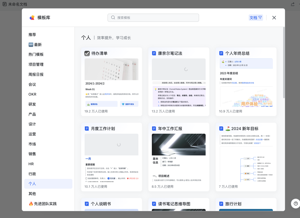 实际上,飞书自身也提供了一些个人模板,但它们被藏在了文档中的模板库推荐中,且质量和数量都无法与团队协作模板相比。这意味着,对于个人用户的需求,飞书官方并未给予足够的重视。