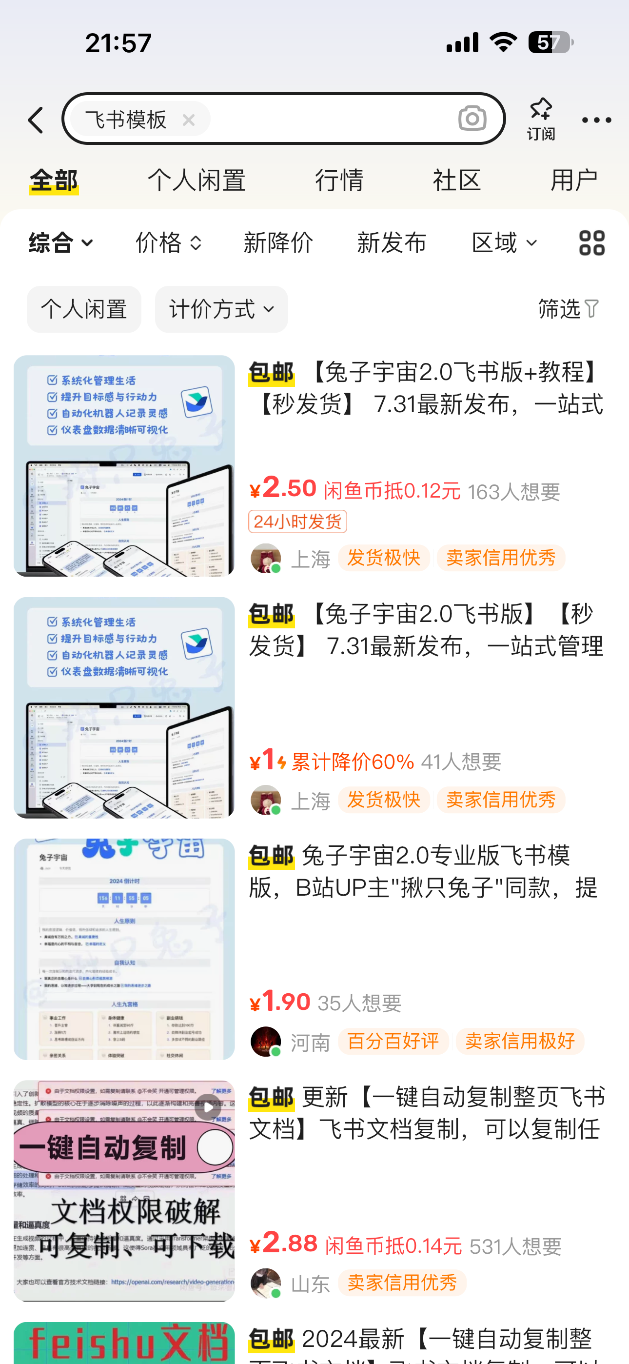 在闲鱼等平台购买现有的飞书模板并改造:有些设计者会在二手平台上出售他们的模板,我们可以购买后,根据自己的理解和市场需求进行优化和改进。